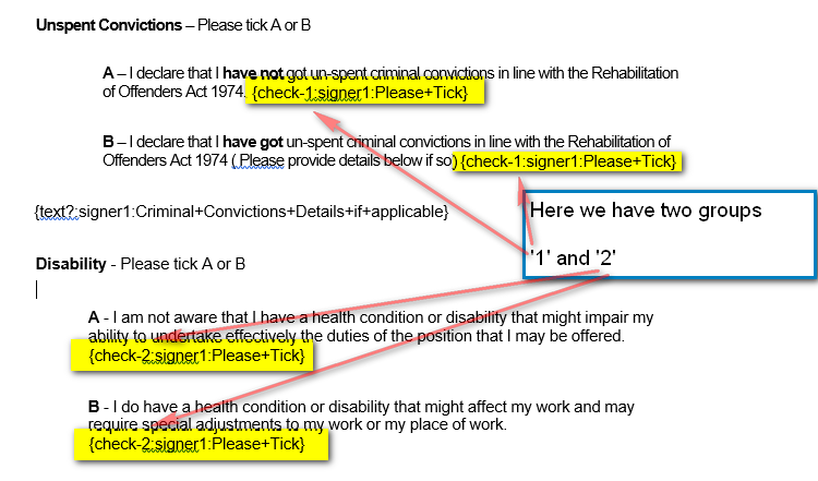 In the above examples there are TWO Checkbox groups (one group 'convictions') and one group ('disabilities)
