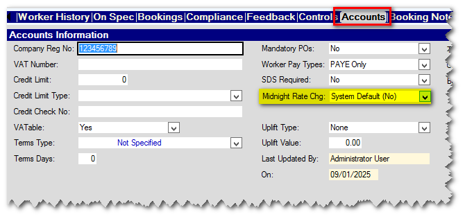 | NB: After Version 1.00.20.077 this midnight switch-over can be controlled by SITE. Go to the [Accounts] tab of a client and use the "Midnight Rate Chg" to select how things behave for that specific client. | ![]() |