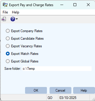 Export Match Rates | This will export rates which have been setup on the 'Booking match' which links a candidate to a client/Site {These rates can be found by opening the records seen on the [Work History] tab of a worker. They are ideal when a worker gets some special or non-standard rates at a given client. e.g. Fred Smith gets special rates at ABC Ltd when he goes there as an FLT Driver} |