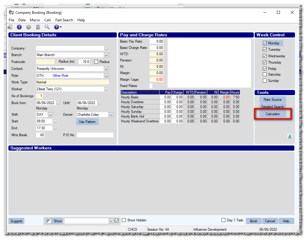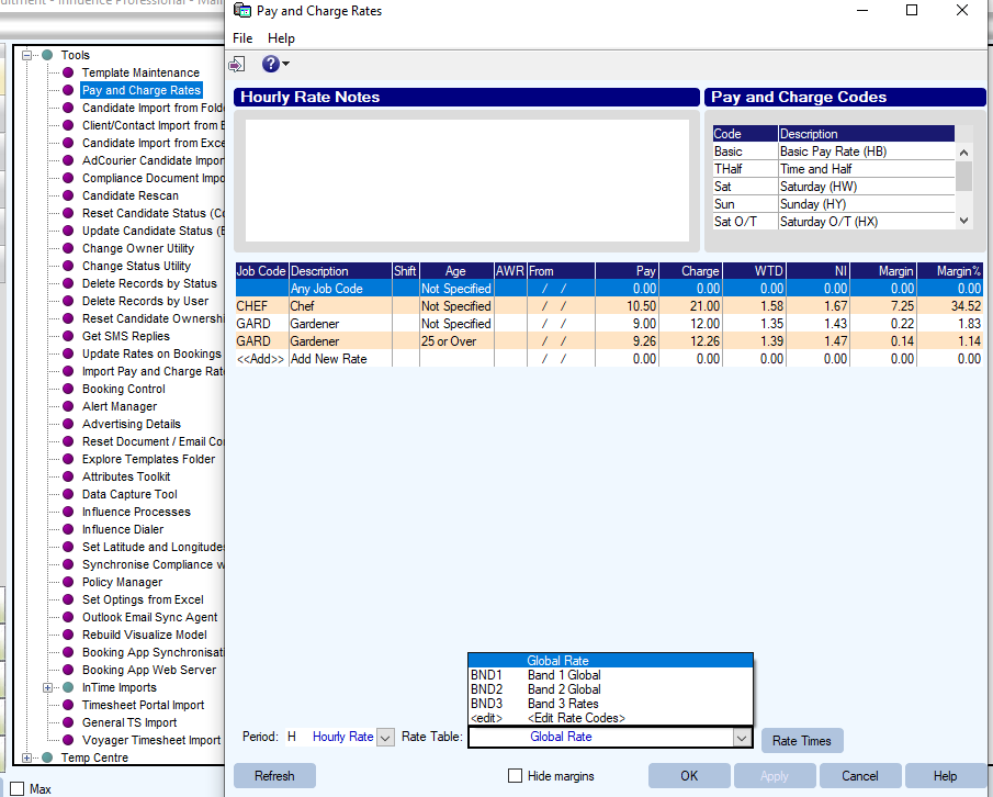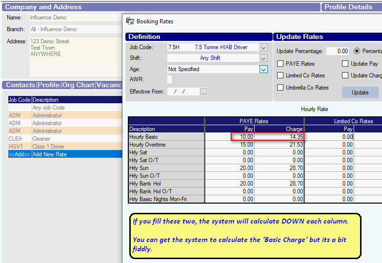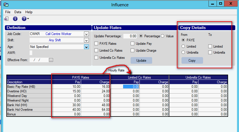 When using the Influence system to book Temporary workers it is possible to store pay and charge rates in the system. When a booking is made, the system will attempt to look-up the correct pay/charge rate applicable to the booking.