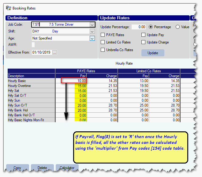 To accomodate this, from version 1.00.24.175 or later, it is now possible to setup a Pay type for PAYE and indicate that it is rolled-up. On Rate Cards, there is an additional column added to accomodate these Rolled-Up pay rates.