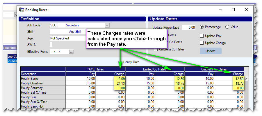 In this example you can see that the PAY rates for Basic/Overtime come from the Candidate, but the Charge Rates come from the Client.