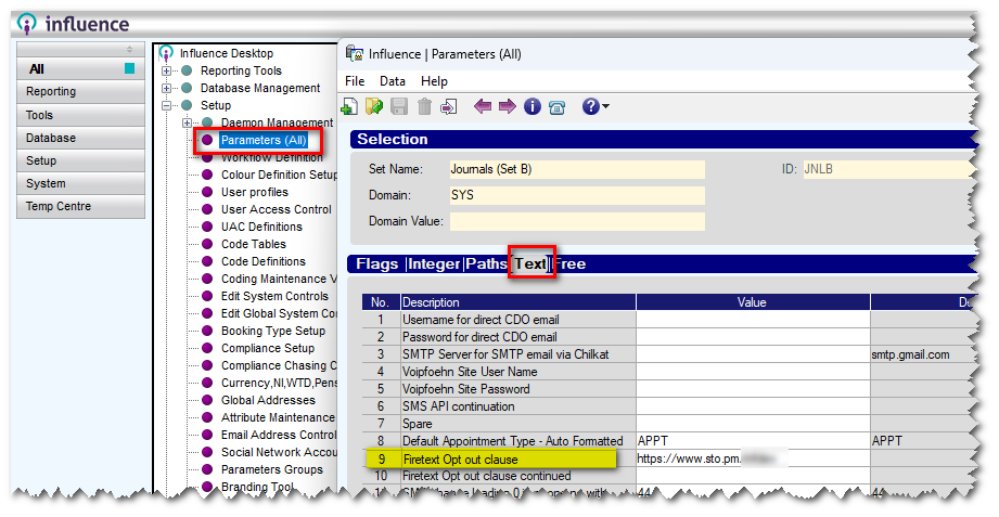 Go to Maintenance > Setup > Parameters then select the parameter set JNLB, choose the [Text] tab and set the Firetext Opt Out clause.