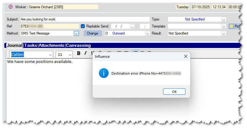 Create a journal in Influence as you normally would (e.g. Click the 'mobile' icon next to a candidate mobile number.)