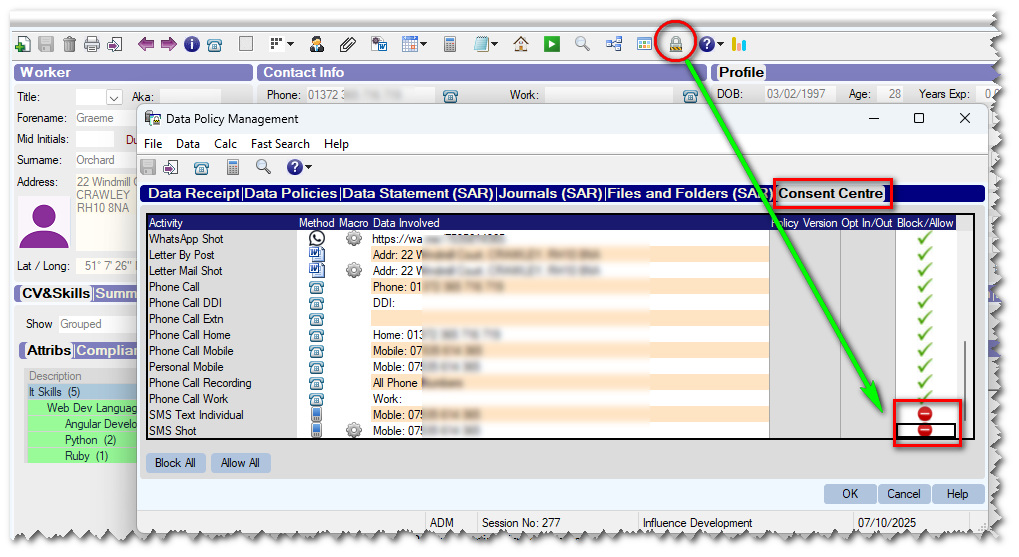 Go to the candidate and open their record. In the toolbar at the top of the system, click the Padlock icon and select the [Consent Centre] - scroll to the bottom and block/prevent communication by SMS