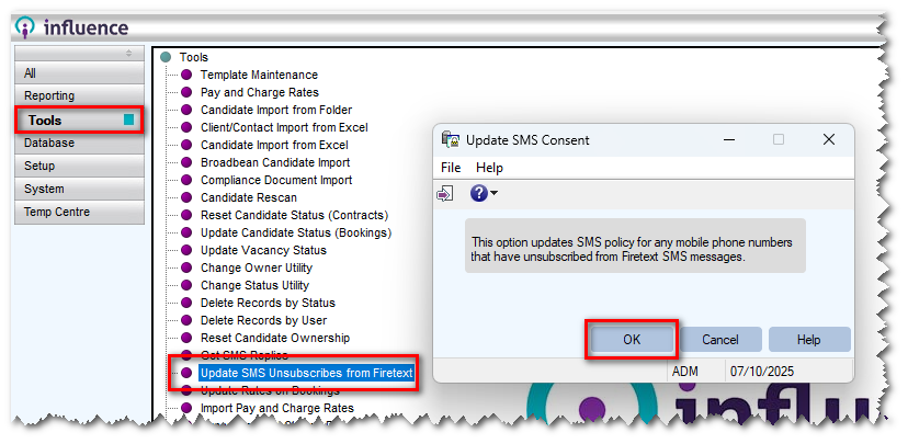 Maintenance > Tools > Update SMS Unsubscribes from Firetext then press [OK]