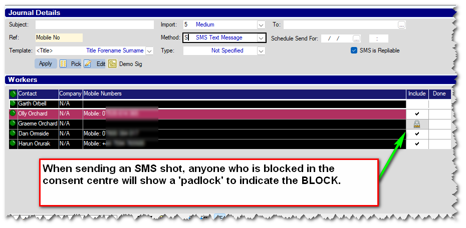 Click [OK] to send the SMS and record a copy of the journal in the database.