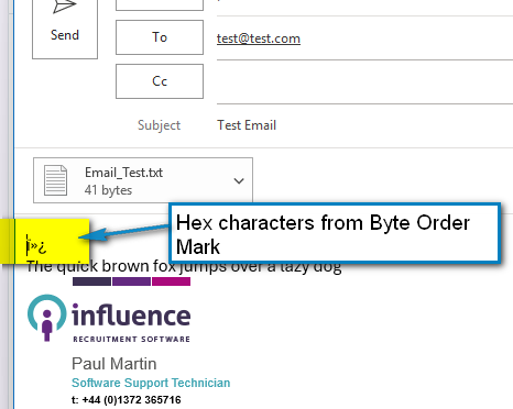 If signature htm files in Outlook have been saved with an Encoding that has a byte order marker (BOM) i.e. UTF-8 BOM, users may see some 'odd' characters at the very beginning of any email that is passed across to Outlook.