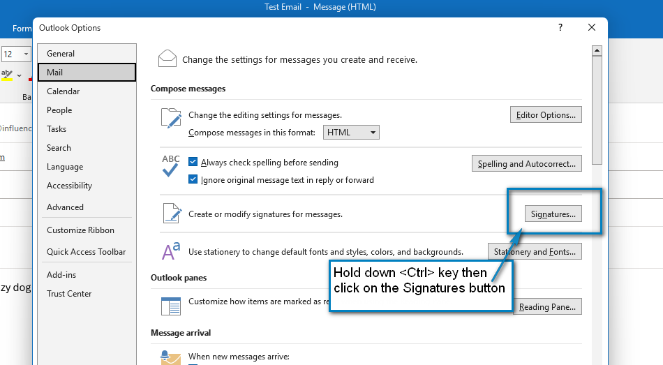| TIP: An easy way to get to the folder location of your Outlook signatures is to open Outlook and navigate to File > Options > Mail. When you see the [Signatures] button, hold Ctrl and click on the button. This will open the folder location of your saved Outlook signature files. Once you look there you can see what the Actual names of the HTML signature files are. See below |