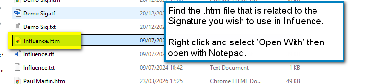 | INFO: The newest versions of influence (1.00.23.041 or later) include an email signature picker to make this process easier and allow Influence to store multiple email signatures for a user to choose from. Older versions allow the linking of one MS Outlook email signature to your Influence User ID. |