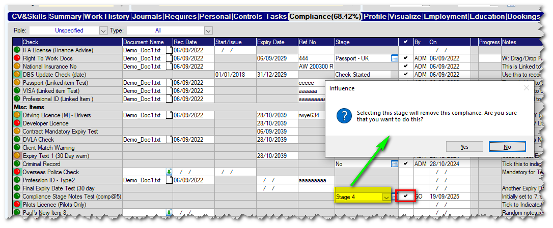 - Changing the STAGE of a compliance item will now warn the user if this choice will invalidate the compliance item. Selecting YES will set the stage and remove the tick so that the item is no longer complete. (See Below)