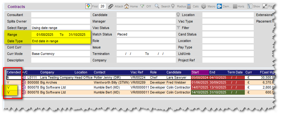 When viewing expiring contracts using the [contracts] workbench, a new column is available to show if the contract being viewed has been Extended (or not). Tol column can be added from the choice of available columns and displayed on-screen. (See below)