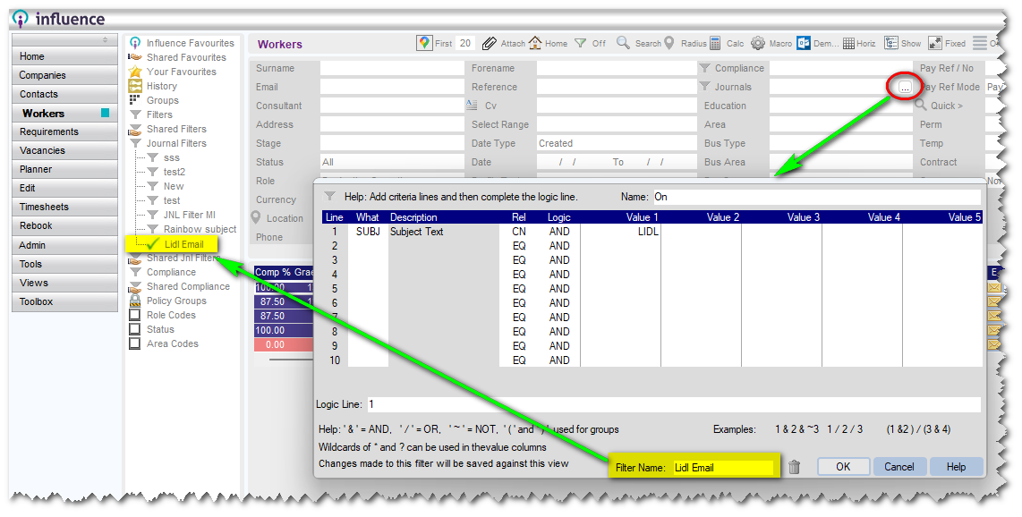 When using the [Journals] filter criteria on the Companies, Contacts, Vacancies and Candidates (Workers) workbenches, these filters can now be saved at the lefthand side of the workbench for quick access.