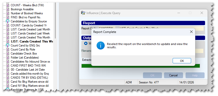 - Improved message when running IQ Reports. The system now explains that you must close the report and then reselect the report to see the new output. If the report is run to a 'local file' the system will automatically open the directory where the report was saved after it has finished running.