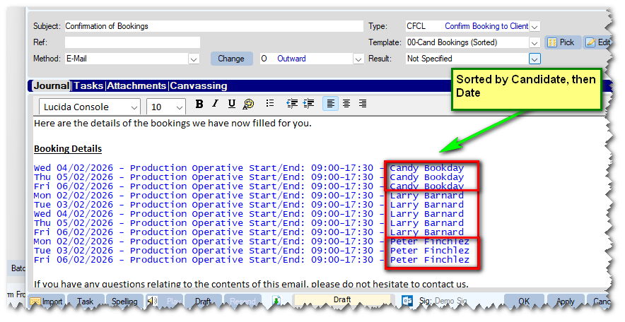 If you are sending a confirmation email to a client, listing all the workers they have had "This Week" or "Last Week", etc. It is now possible to sort the list of bookings into CANDIDATE Order. (Previously all bookings were listed Chronologically)