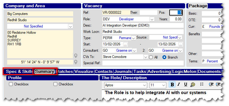 - It is possible to setup the VACANCY record to show the CV&Skills tab, Summary Tab, or BOTH.