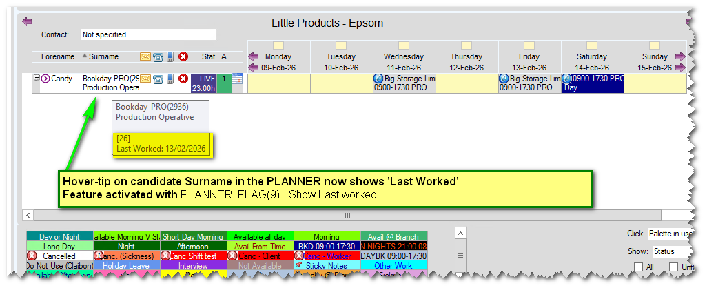 From this release hovering over the worker surname on the planner will show the "Last booked Date" (prior to TODAY) for the worker. The feature is activated/deactivated with parameter PLANNER, Flag(9) - Show Last Worked.